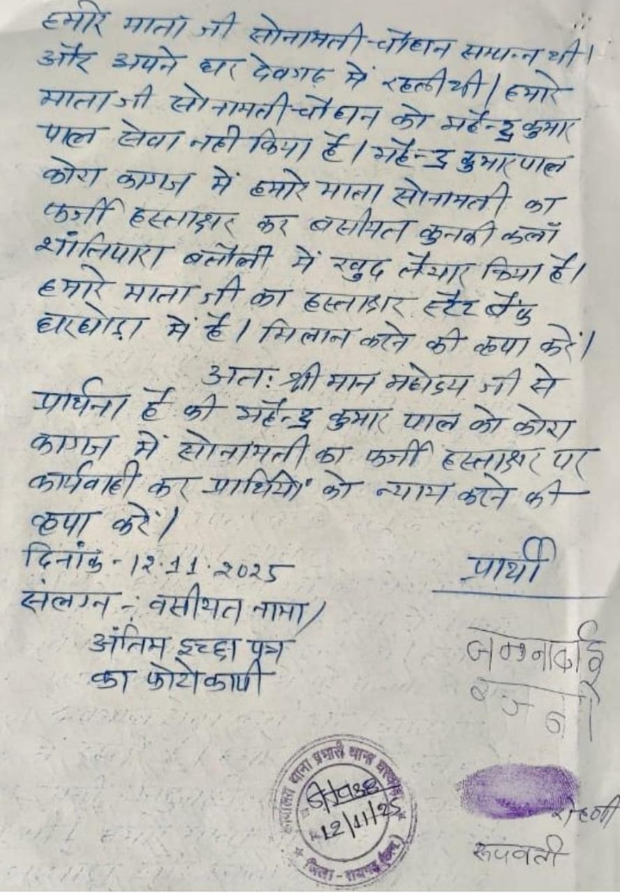 परिवार ने घरघोड़ा थाना प्रभारी से महेंद्र कुमार पाल के विरुद्ध जालसाजी और धोखाधड़ी के मामले में कार्रवाई की मांग की है।साथ ही, उन्होंने अपनी माँ की वसीयत की प्रति भी आवेदन के साथ संलग्न की है ताकि दस्तावेज़ों की सत्यता की तुलना की जा सके।