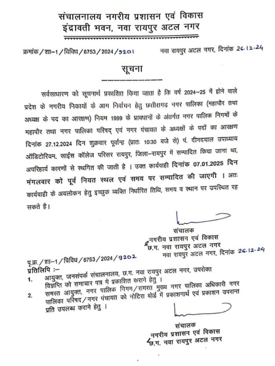 नगरीय निकायों में चुनाव के लिए वार्डों के आरक्षण के बाद अब निकायों के महापौर और अध्यक्षों के पदों का आरक्षण टल गया है। वहीं अब नए साल में नई तारीख में पदों का आरक्षण होगा। जारी नए आदेश के अनुसार अगले साल यानी 7 जवनरी को सभी नगर निगम, नगर पालिका और नगर पंचायतों के आरक्षण रायपुर में किया जाएगा। संभावित स्थान रायपुर पंडित दीनदयाल उपाध्याय ऑडिटोरियम ही होगा। इस संबंध में नगरीय प्रशासन विभाग ने नई सूचना जारी कर दी है। वहीं इसके बाद प्रदेश में अचार संहिता लगना संभावित है।