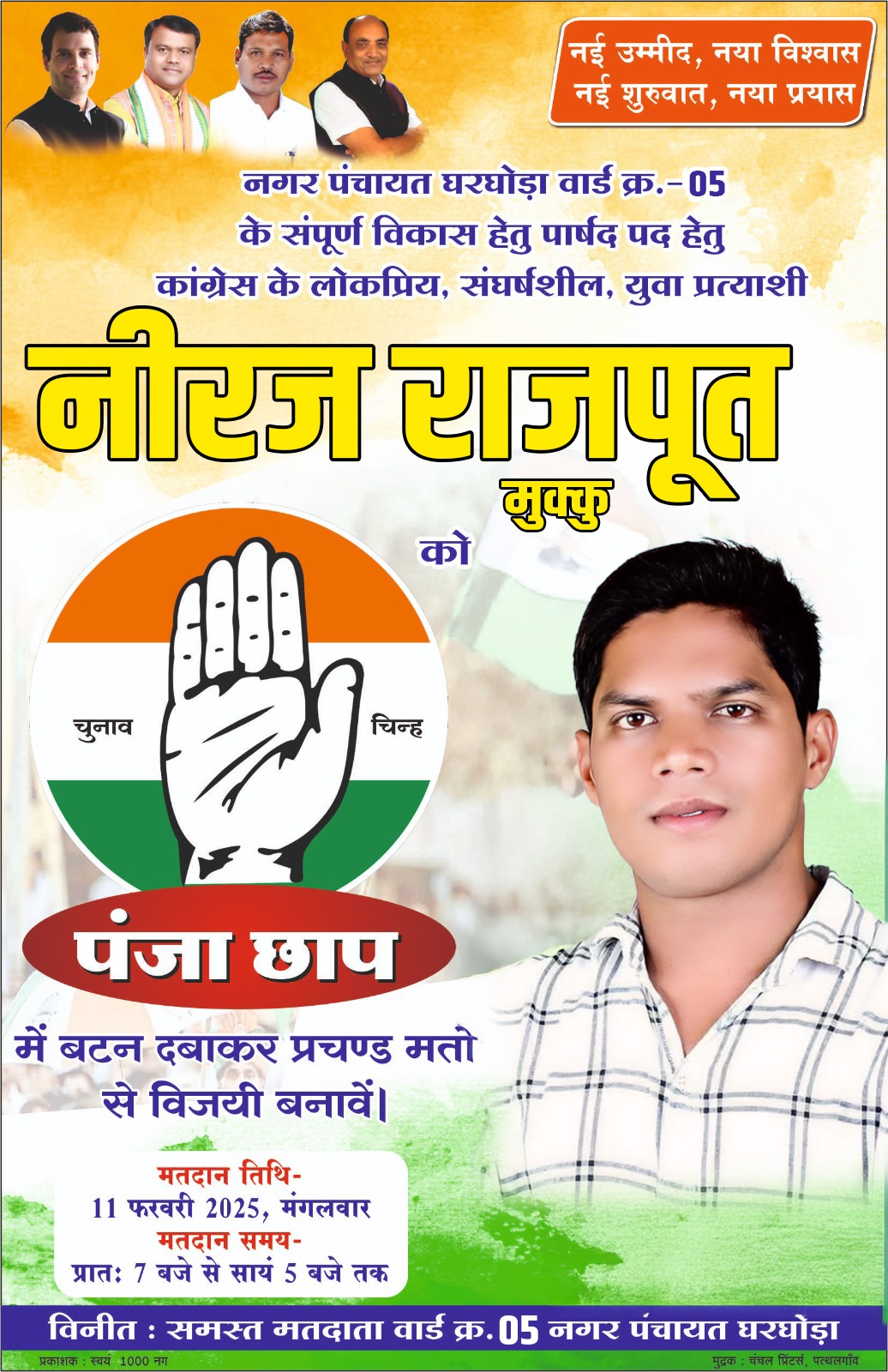 घरघोड़ा। नगर पंचायत चुनाव के अंतर्गत वार्ड क्रमांक 5 में कांग्रेस के युवा प्रत्याशी नीरज राजपूत मजबूती से चुनावी मैदान में डटे हुए हैं। उनकी सरल और स्वच्छ छवि, लंबे समय से पार्टी के प्रति उनकी निष्ठा और जनता से सीधा संवाद उन्हें इस चुनाव में मजबूत दावेदार बना रहा है। वार्ड में उनके पक्ष में माहौल बनता दिख रहा है, जिससे विरोधियों की चिंताएँ बढ़ गई हैं।
