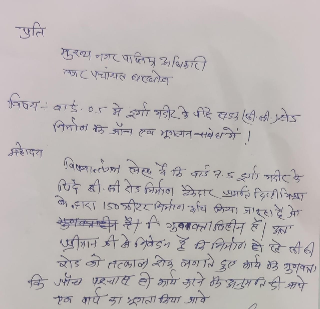 जब स्थानीय नागरिकों ने इस भ्रष्टाचार की शिकायत की तो मुख्य नगर पालिका अधिकारी (सीएमओ) सुश्री दीपिका भगत ने बेहद गैर-जिम्मेदाराना जवाब देते हुए कहा, “शिकायत है तो पार्षद से मिलिए।” यही नहीं, शिकायतकर्ता द्वारा बताया गया कि पार्षद खुद मौके पर खड़े होकर घटिया सड़क निर्माण का समर्थन कर रहे थे, तब भी सीएमओ ने मामले से पल्ला झाड़ लिया और मौके से चली गईं।