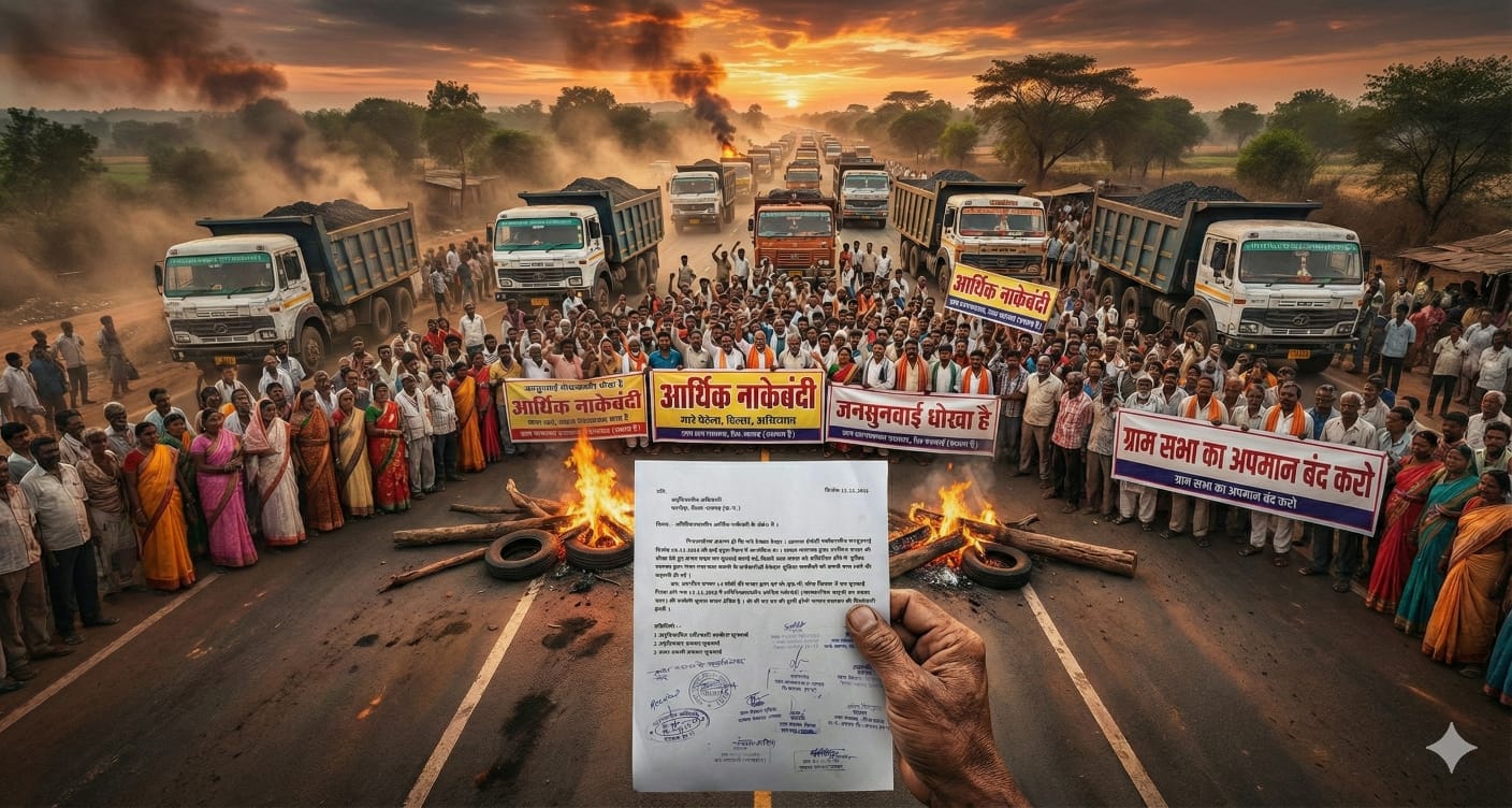 14 गांवों का एक ही नारा :”जब तक सुनवाई रद्द नहीं, तब तक रास्ता बंद” – इस “छल-कपट” के विरोध में धौराभांठा, टांगरघाट, आमगांव, बिजना, बुड़िया, लिबरा, झिंकाबहाल, झरना और खुरुसलेंगा समेत 14 गांवों की जनता एक हो गई है। ग्रामीणों ने 12.12.2025 से अनिश्चितकालीन आर्थिक नाकेबंदी शुरू करने पत्र SDM को सौंप दिया है इसका सीधा मतलब है कि क्षेत्र से व्यावसायिक वाहनों और कोयला परिवहन का पहिया पूरी तरह थम जाएगा।