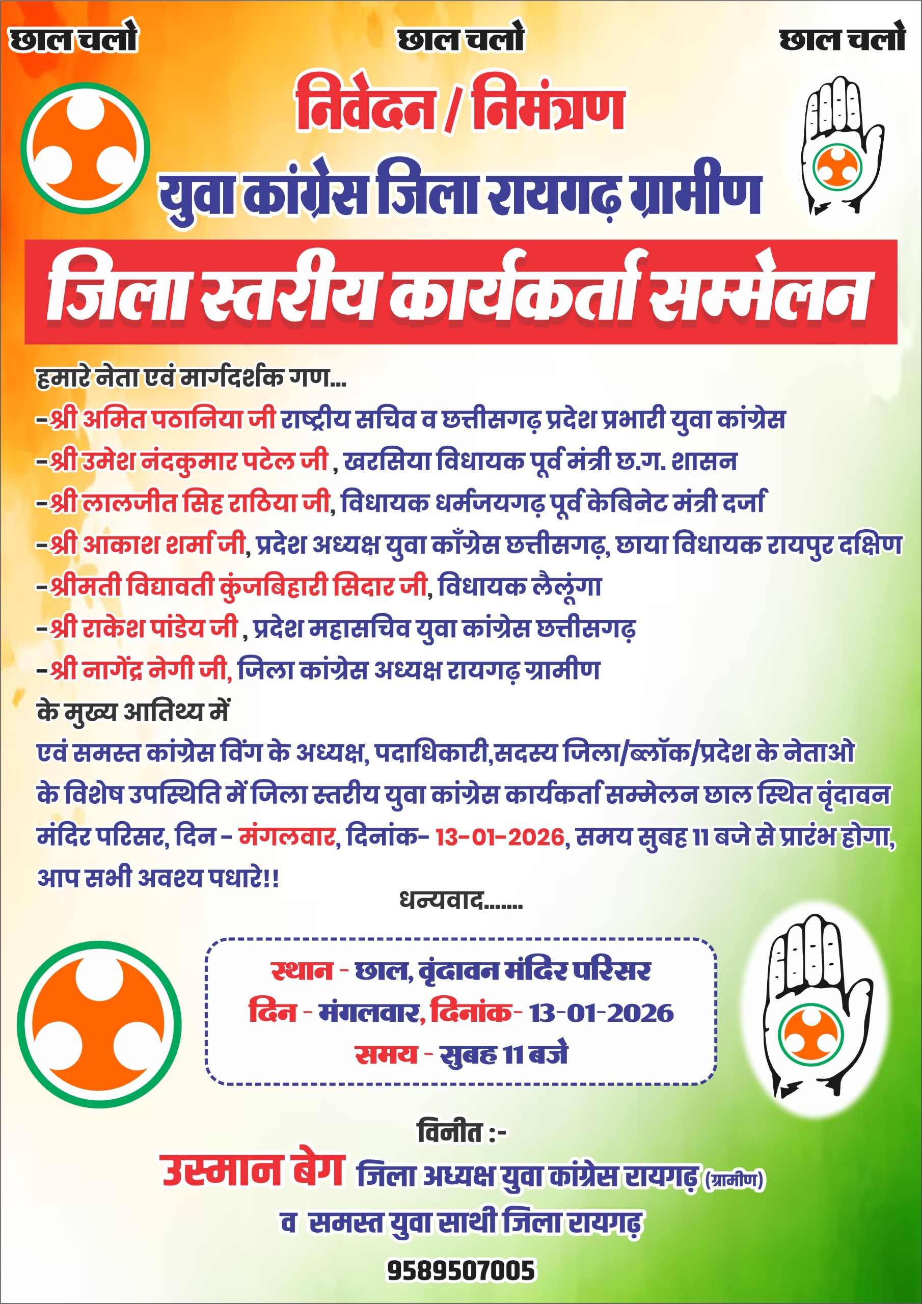 रायगढ़ – युवा कांग्रेस इन दिनों लगातार जमीनी स्तर पर सक्रिय रूप से बैठक और कार्यक्रम कर युवाओं को जोड़ने अभियान चला रही है , इसी तारतम्य जिला युवा कांग्रेस रायगढ़ ग्रामीण जिला अध्यक्ष उस्मान बेग के नेतृत्व में छाल वृंदावन मंदिर परिषर में सैकड़ो युवाओं के साथ जिला स्तरीय बड़ी बैठक आयोजित करने जा रही है जिसमें श्री अमित पठानिया जी (राष्ट्रीय सचिव व छत्तीसगढ़ प्रदेश प्रभारी युवा कांग्रेस, श्री उमेश नंदकुमार पटेल जी , खरसिया विधायक पूर्व मंत्री छ.ग. शासन , श्री लालजीत सिह राठिया जी, विधायक धर्मजयगढ़ पूर्व केबिनेट मंत्री दर्जा, श्री आकाश शर्मा जी, प्रदेश अध्यक्ष युवा कॉंग्रेस छत्तीसगढ़, छाया विधायक रायपुर दक्षिण, श्रीमती विद्यावती कुंजबिहारी सिदार जी, विधायक लैलूंगा, श्री राकेश पांडेय जी , प्रदेश महासचिव युवा कांग्रेस छत्तीसगढ़, जिला कांग्रेस अध्यक्ष नागेंद्र नेगी जी के मुख्य आतिथ्य में एवं कांग्रेस विंग के समस्त अध्यक्ष, पदाधिकारी,सदस्य जिला/ब्लॉक/प्रदेश के नेताओ के विशेष उपस्थिति में जिला स्तरीय युवा कांग्रेस कार्यकर्ता सम्मेलन छाल स्थित वृंदावन मंदिर परिसर, दिन – मंगलवार, दिनांक- 13-01-2026, समय सुबह 11 बजे से प्रारंभ होगा ।। इस कार्यक्रम को लेके जिला युवा कांग्रेस रायगढ़ ग्रामीण युद्ध स्तर पर तैयार चालू कर दी है