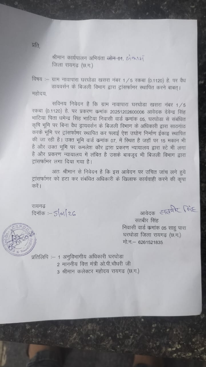 शिकायत में उल्लेख है कि ग्राम नावापड़ा घरघोड़ा खसरा नंबर 1/5 रकबा 0.1120 हेक्टेयर ( देवेंद्र सिंह भाटिया पिता धर्मेंद्र सिंह भाटिया )कृषि भूमि है, जिस पर बिना वैध अनुमति के विद्युत विभाग के अधिकारियों द्वारा सांठ-गांठ कर ट्रांसफार्मर स्थापित कर दिया गया। बताया गया कि उक्त भूमि पर प्लाई उद्योग निर्माण की तैयारी की जा रही है, जबकि भूमि का डायवर्जन नहीं किया गया है।