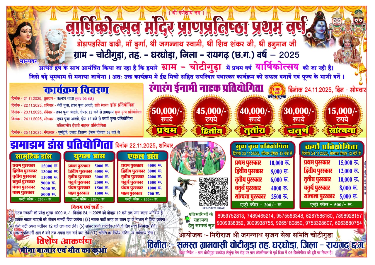 घरघोड़ा ब्लॉक के ग्राम चोटीगुड़ा में 24 नवंबर को एक बड़ा राजनीतिक और धार्मिक आयोजन देखने को मिलेगा। गिरिराज श्री जगन्नाथ श्रीजन सेवा समिति द्वारा आयोजित मंदिर प्राण-प्रतिष्ठा एवं वार्षिकोत्सव में छत्तीसगढ़ कांग्रेस के दो शीर्ष नेता:पूर्व उपमुख्यमंत्री टी.एस. सिंहदेव और छत्तीसगढ़ कांग्रेस अध्यक्ष दीपक बैज शामिल होंगे।