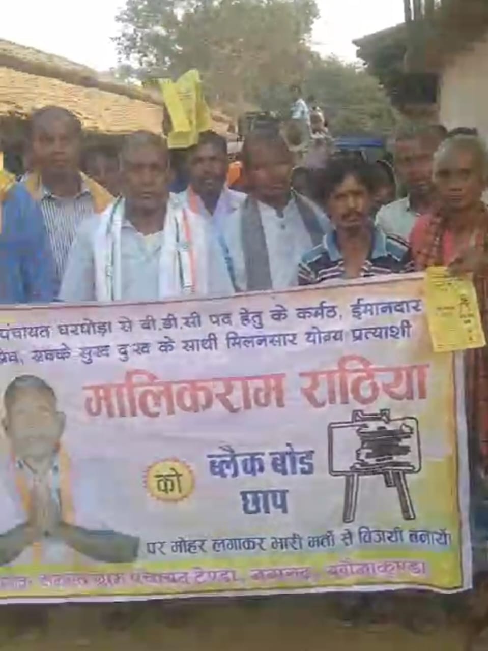 घरघोड़ा जनपद चुनाव में क्षेत्र क्रमांक 10 से ब्लैकबोर्ड छाप प्रत्याशी मलिक राम राठिया के प्रति मतदाताओं का झुकाव तेजी से बढ़ता जा रहा है। प्रचार के दौरान लोगों की भारी भीड़ और उनका उत्साह मलिक राम के पक्ष में माहौल बना रहा है।मलिक राम के चुनावी जनसंपर्क को जनता का जबरदस्त समर्थन मिल रहा है, जिससे उनके विरोधी प्रत्याशियों की चिंताएँ बढ़ गई हैं।स्थानीय लोगों का मानना है कि मलिक राम लंबे समय से जनता के बीच सक्रिय रहे हैं और उनकी छवि एक कर्मठ और जमीनी नेता की बनी हुई है। उनके प्रति जनता की इस निष्ठा ने चुनावी माहौल को अपने पक्ष में मोड़ दिया है।