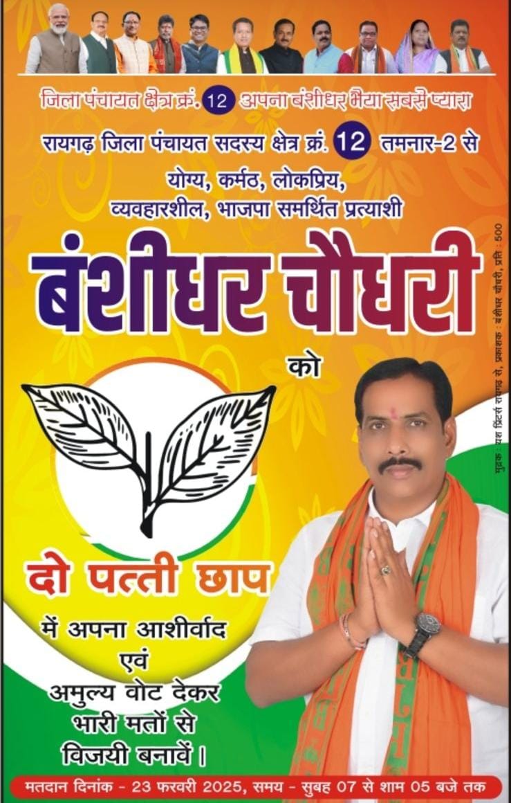 रायगढ़:जिला पंचायत क्षेत्र क्र• 12 (तमनार-2) से डीडीसी पद के प्रत्याशी बंशीधर चौधरी जो अब तक अपने दृढ़ संकल्प और समर्पण से क्षेत्र में पहचान बना चुके हैं, उनके जनसम्पर्क अभियान को हर ओर से अभूतपूर्व समर्थन मिल रहा है। वे अपने समर्पण से जनता के दिलों में जगह बना चुके हैं, और उनकी नेतृत्व क्षमता का लोहा हर वर्ग और समुदाय मान रहा है।उनके द्वारा किए गए सामुदायिक कार्य, जैसे स्वास्थ्य शिविर, शिक्षा संबंधी पहल, और युवा सशक्तिकरण से जुड़ी योजनाओं ने उन्हें आम जनता के बीच एक सशक्त नेतृत्व के रूप में स्थापित किया है।