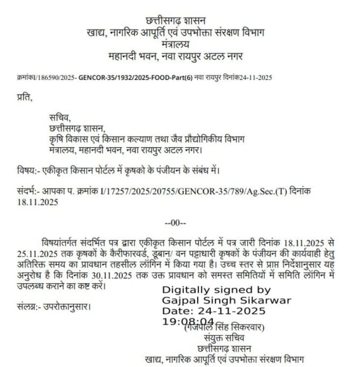 रायपुर। छत्तीसगढ़ शासन के खाद्य एवं नागरिक आपूर्ति विभाग ने किसानों को बड़ी राहत देते हुए एकीकृत किसान पोर्टल में फसल पंजीयन की अंतिम तिथि बढ़ा दी है। पहले यह अवधि 18 से 25 नवंबर तक तय थी, लेकिन तकनीकी दिक्कतों, पोर्टल की धीमी गति और कई किसानों के रजिस्टर्ड मोबाइल नंबर उपलब्ध न होने जैसी समस्याओं को देखते हुए विभाग ने समय सीमा 30 नवंबर 2025 तक बढ़ाने का निर्णय लिया है।