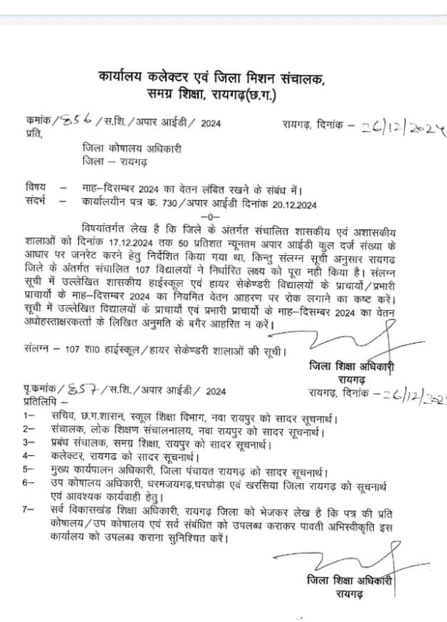 प्रभारी प्राचार्य का रोका गया वेतन,अपार बनाने में बेपरवाही पर कार्यवाही