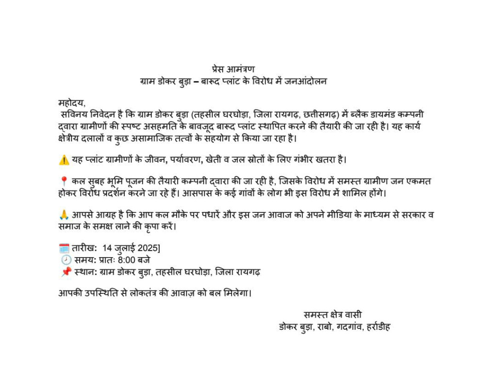 ग्रामीणों का कहना है कि ब्लैक डायमंड कंपनी क्षेत्रीय दलालों और असामाजिक तत्वों की मदद से बारूद प्लांट स्थापित करने की कोशिश कर रही है, जबकि गाँव के अधिकांश लोग इसके सख्त खिलाफ हैं। स्थानीय निवासियों ने इस प्लांट को जीवन, पर्यावरण, खेती और जल स्रोतों के लिए गंभीर खतरा बताया है। उनका दावा है कि इससे ग्रामीणों के स्वास्थ्य और जीवनशैली पर प्रतिकूल असर पड़ेगा। इस जनआंदोलन में डोकर बुड़ा के साथ-साथ आसपास के कई गाँवों के ग्रामीण भी शामिल होंगे। आयोजनकर्ताओं ने मीडिया से अपील की है कि वे मौके पर पहुंचकर इस जन-आवाज़ को सरकार और समाज के सामने लाने में मदद करें।